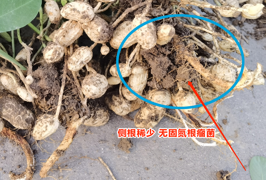 △ 常規(guī)農(nóng)戶種植側(cè)根稀少,無(wú)固氮根瘤菌,籽粒下且多空粒