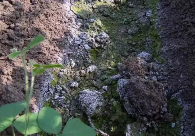鹽漬化在大棚里表現(xiàn)有三種情況:第一種是輕度鹽漬化,表現(xiàn)是地表起“綠苔”,澆水后兩三天,地面上出現(xiàn)一層綠苔;如果澆水后地表出現(xiàn)一層“白霜”,則是第二種情況——中度鹽漬化;第三種是重度鹽漬化,如果地表濕潤(rùn)的話,有一塊一塊的紅色膠狀物,如果土壤干燥的時(shí)候地面表現(xiàn)為“紅磚”似的一層紅苔。這個(gè)就是土壤鹽漬化的表現(xiàn)。