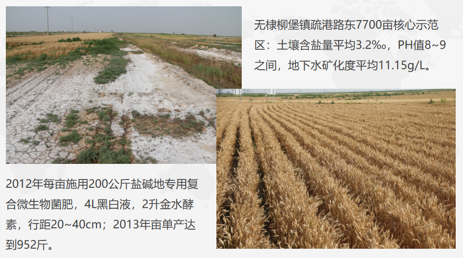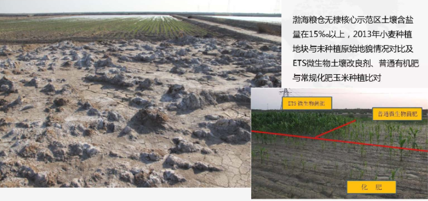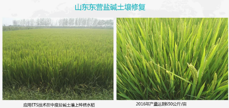 ◆ETS鹽堿地土壤修復(fù)技術(shù)已在國家科技部十二五科技支撐計(jì)劃“渤海糧倉科技示范工程”中作為關(guān)鍵共性技術(shù)在山東黃三角地區(qū)鹽堿地上大面積推廣。目前已經(jīng)治理鹽堿地總面積130.7萬畝,新增糧食生產(chǎn)能力5.2億公斤。
